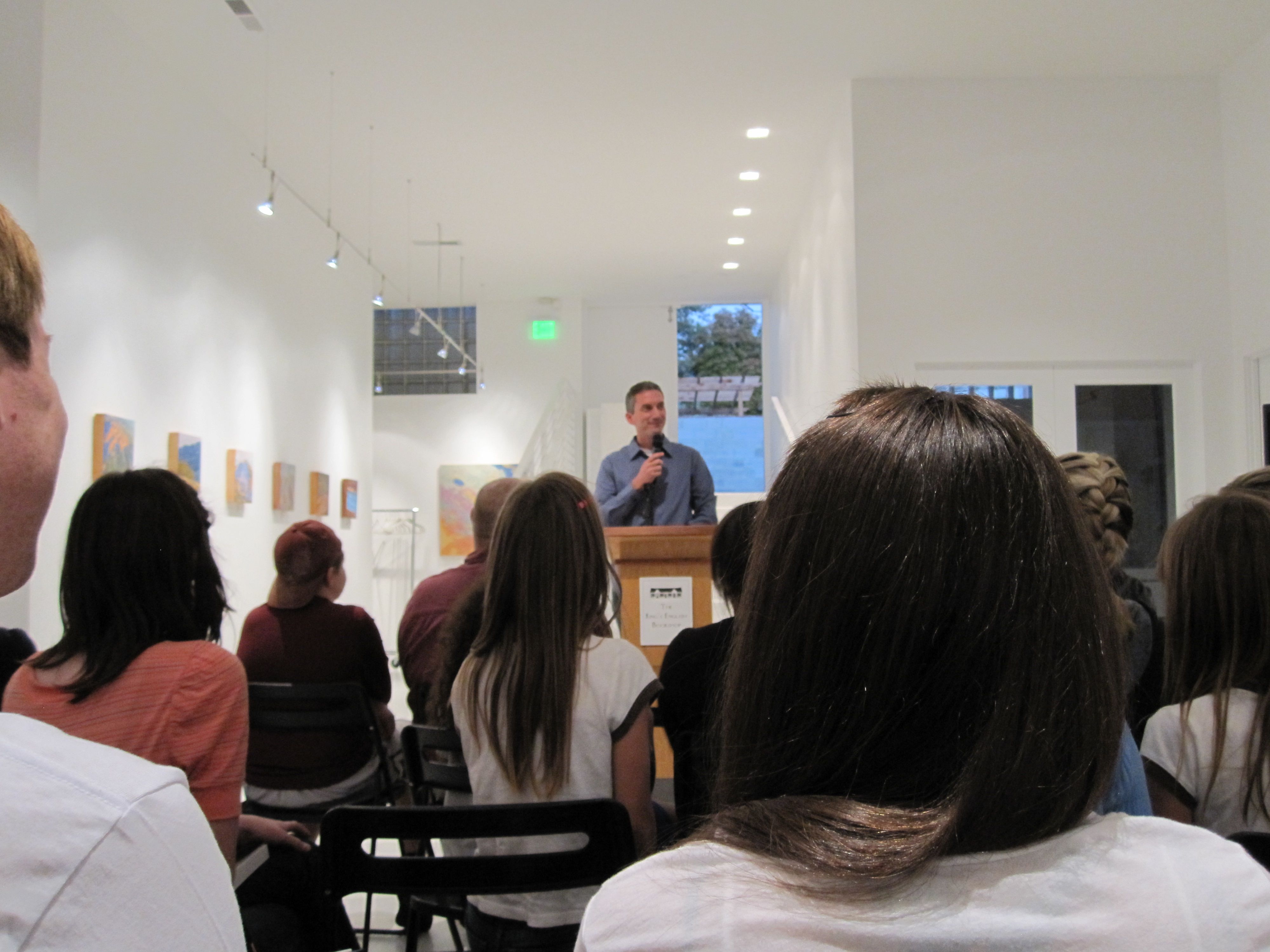 I bought my book at The King’s English and met my friends, Amber and Alyssa, at the gallery where the presentation was going to be. Amber got her book at Barnes and Noble and it had exclusive material at the end. WHAT. Jealous. I got the ebook and I was excited that it came with the cover art this time. The room was pretty packed and chairs filled up quickly. I was delighted that there were lots of kids there (though I’m glad I didn’t bring mine – there were lots of breakable things. It was an art gallery).