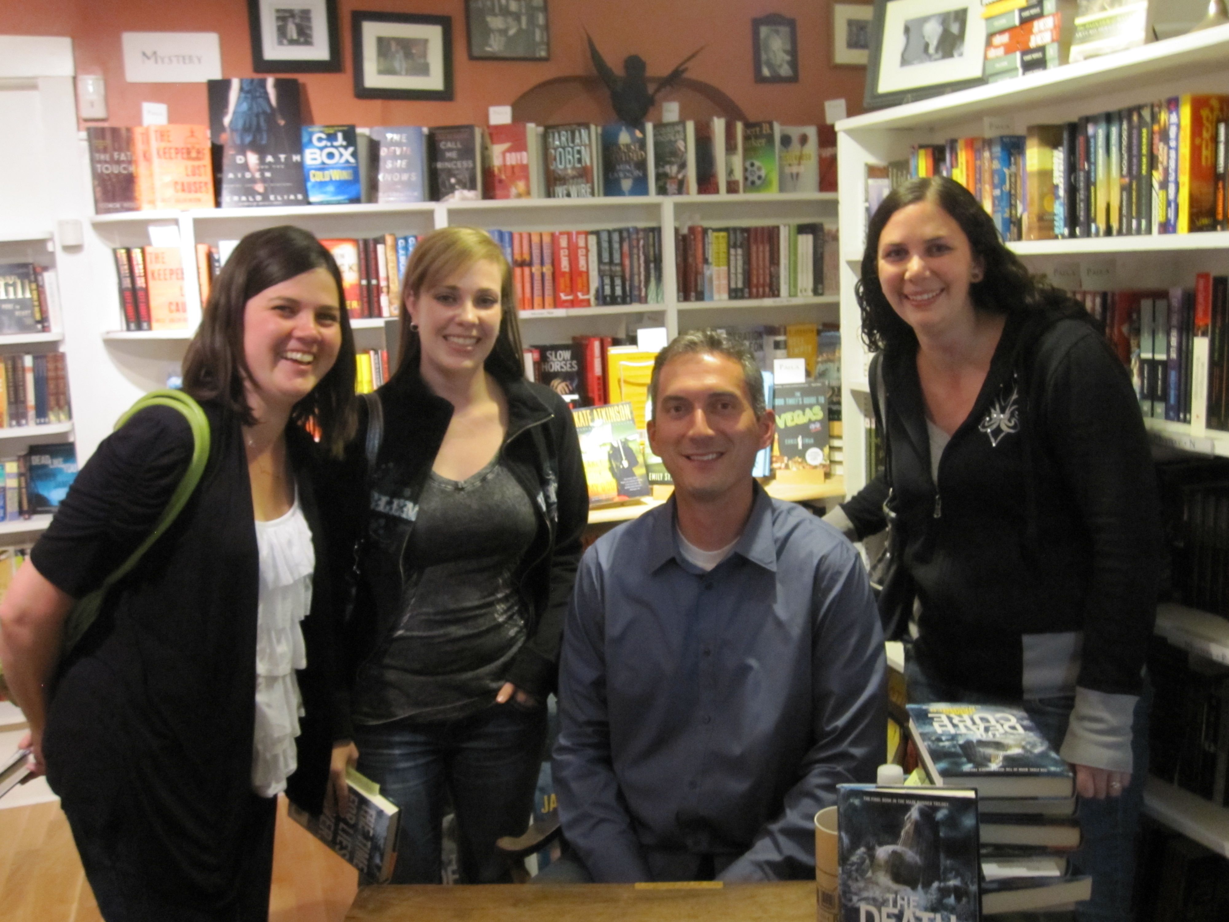 I have been waiting and waiting for The Death Cure by James Dashner to come out (I even wrote up some theories on what I think is going to happen in the book). So I was super excited to find out that the first stop on James Dashner’s tour would be in Salt Lake City. My husband had a conference in Salt Lake, so I picked him up at 5 and dragged him to the book signing two hours early. Since we had time to kill, we decided to go out for dinner and I stopped short when I saw, sitting not two feet away from me on a restaurant patio, James Dashner talking to some guy (I found out later it was his agent). I gave him a dorky wave and smile. He was nice and waved back. Then I whispered to my husband, “That’s James Dashner in the blue shirt – don’t stare.” We decided to eat at that same restaurant on the patio because they served Middle Eastern food and it sounded good. There were only two tables left on the patio – one right next to James Dashner and one right next to the door. I made us sit by the door lest James think I’m a stalker or something and my bewildered husband agreed to sit at the worst table on the patio.