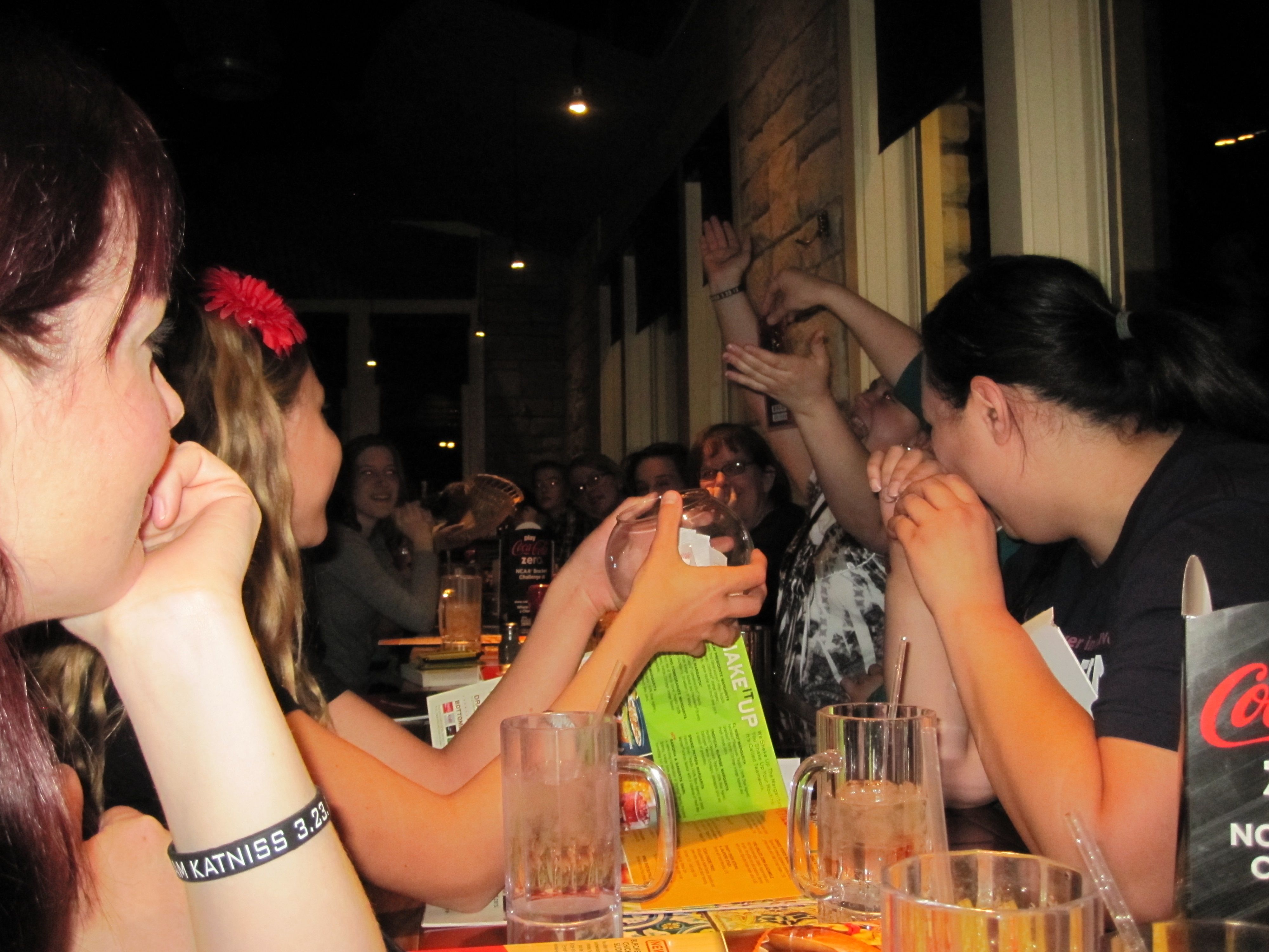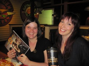 Penelope at The Reading Fever put on an awesome party for some Utah book bloggers to go see The Hunger Games! We went to Chili’s for a late dinner, there was a raffle and I won the totally awesome The Hunger Games: Official Illustrated Movie Companion! And my friend Miriam won a refillable cup. Plus, Penelope got all of us Team Katniss bracelets that have the date on them. Thank you sooo much Penelope!! You rock!